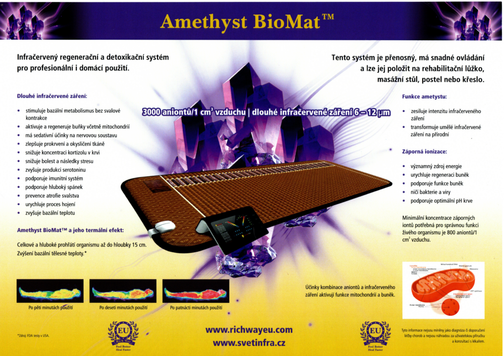 Amethyst BioMat™ je "podložka", kterou položíte na masážní stůl nebo domácí matraci. Prostřednictvím elektronického ovládacího panelu převádí elektrickou energii na dlouhé infračervené záření, neviditelné světlo přírody. Výzkum NASA ukázal, že dlouhé infračervené záření je nejbezpečnější a nejefektivnější světelné záření. Pronikne až 15 centimetrů do měkkých tkání organismu, podporuje proces hojení a regeneraci nervových a svalových tkání.